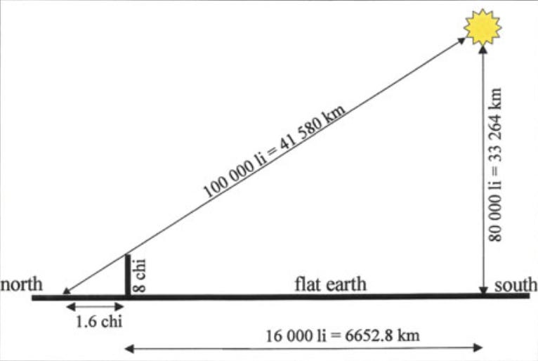 The Chinese of the first millennium BCE believed Earth was a square and heaven was a circle. As in: the Earth was a flat, four-cornered thing, and heaven existed as a flat disc directly above it. The sun, according to this conception, was 80,000 li away (roughly 20,790 miles):