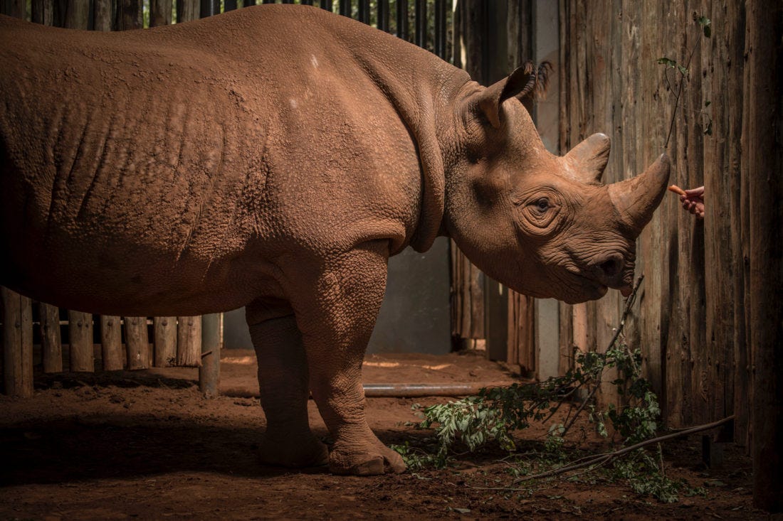 An eight-year-old eastern black rhino male gifted by San Diego Zoo Global has been successfully translocated to the western Serengeti. He appears to be tempted by a carrot. (CJN)