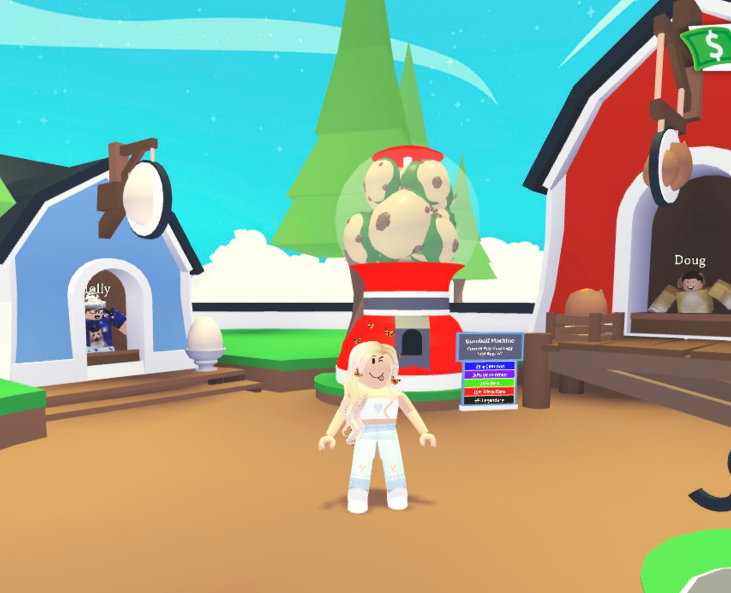 My daughter’s avatar outside the Fossil Egg Gumball Machine in Adopt Me!