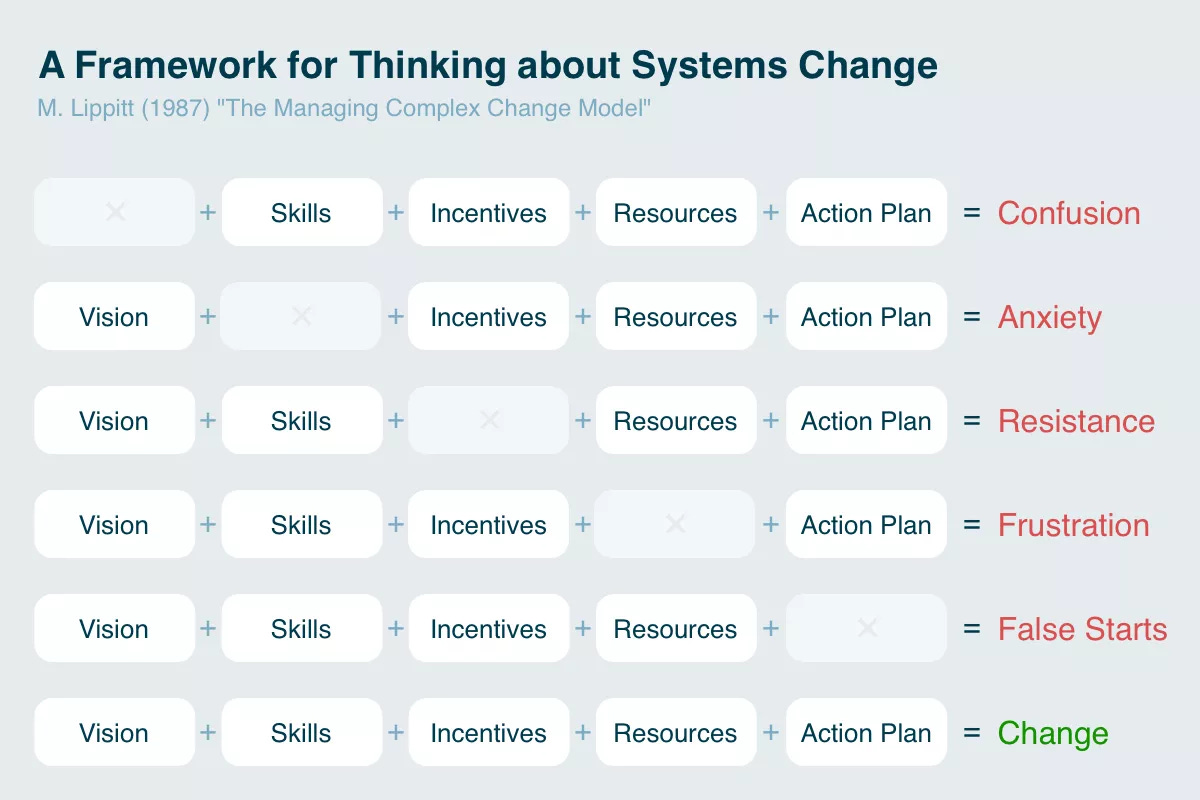 My mom first introduced me to this systems change framework, as it’s come to some prominence in the world of educational change. Over the last year I’ve thought about it a lot as it relates to driving technology change and adoption in large organizations. It’s been top of mind again and wanted to share it. (NRB)