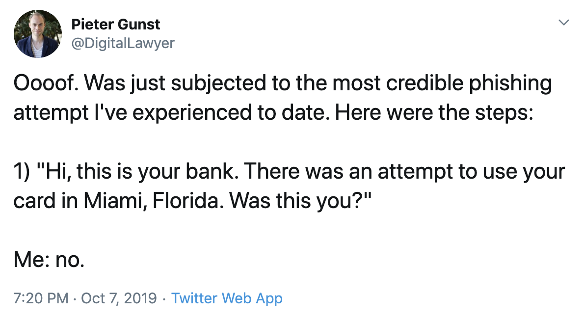 Noah here. For years now I’ve been railing against banks and credit card companies who call you up, inform you of potential fraud, and then ask for your card number to confirm your identity. The danger in the practice is that they train people to feel confident giving a random caller secure bits of information just because they claim to be who they say they are. I’ve been waiting to hear of an example of someone taking advantage of this behavior, and Tuesday on Twitter I saw exactly that by way of a very interesting thread from Pieter Gunst, a lawyer and co-founder of a company called Legal.io:
