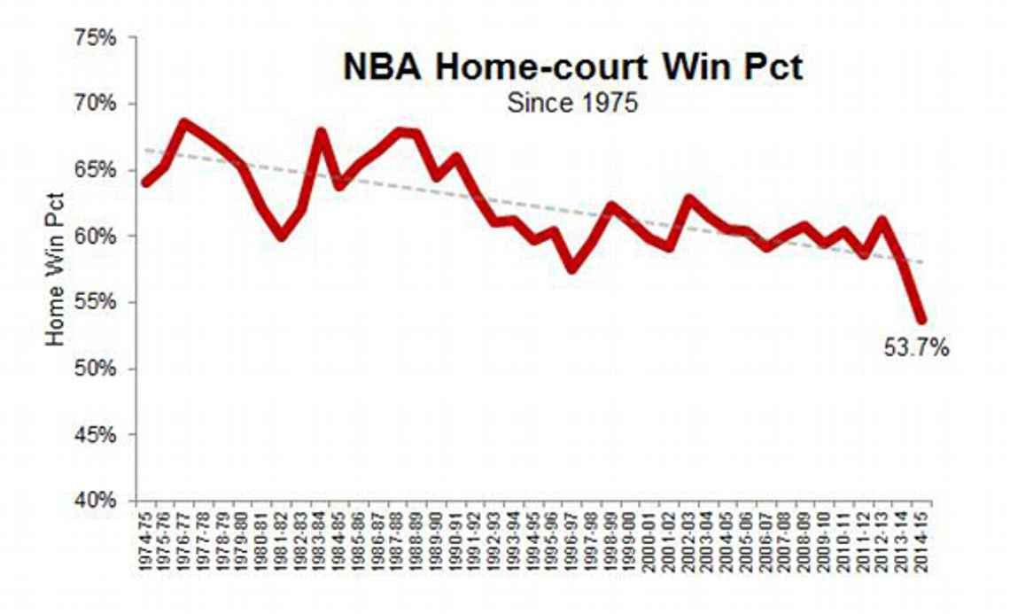 Of course, in bubble basketball, there’s no home-court advantage because there are no home-courts. But, even if there were, the evidence suggests that the benefit of playing in front of your fans has been eroding in the NBA over the last two decades. What once represented a nearly 4-point edge, home court is now worth around one extra basket. What’s more, home teams who used to enjoy a 65% winning percentage are now much closer to 50%. Despite the data, home-court narratives have persisted.