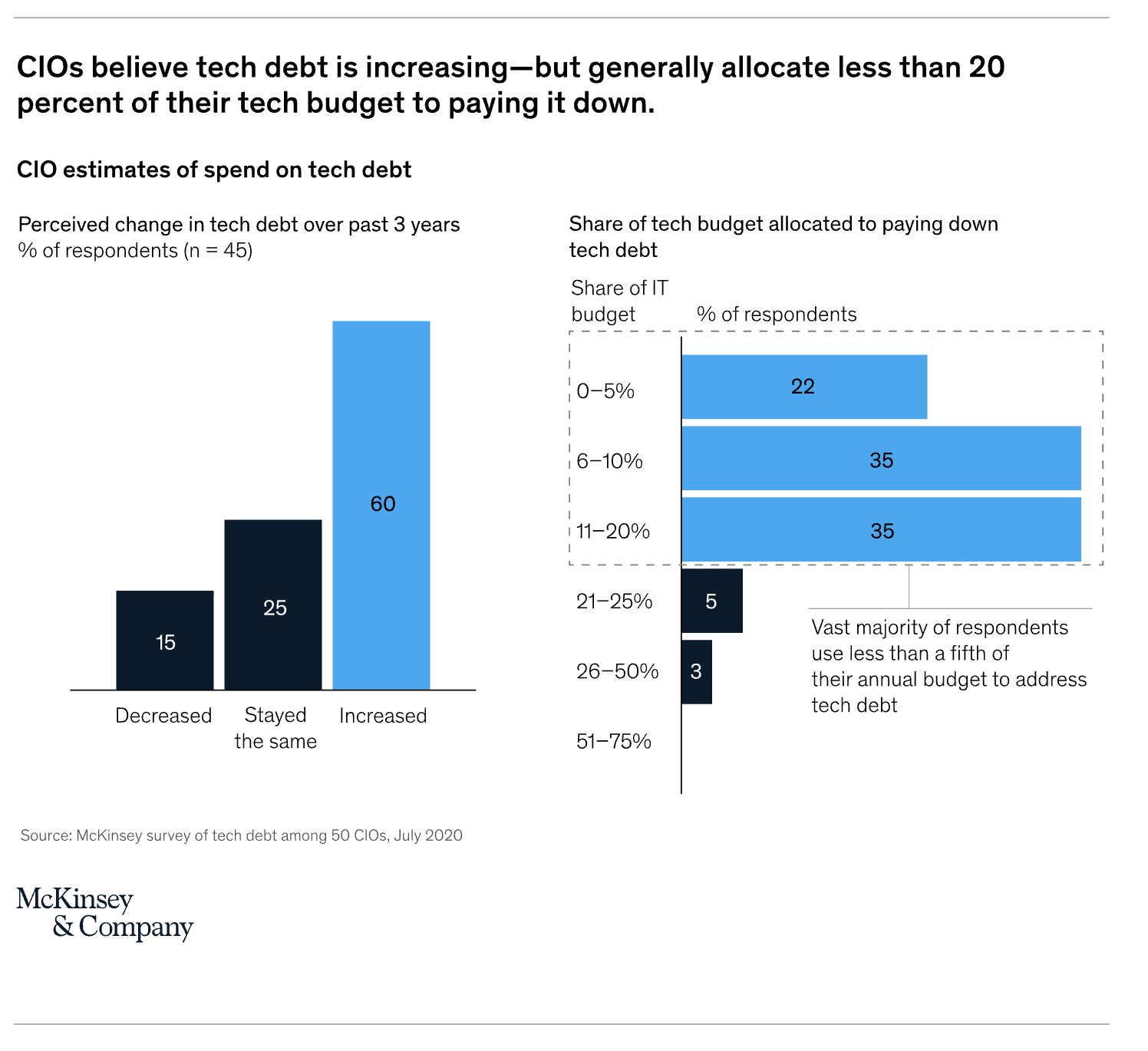 You build debt in your codebase for any number of reasons, most notably taking shortcuts and not understanding the problem to the extent you will in the future. That debt builds if you don’t start to “pay it down” by going back and fixing (refactoring) the code. Eventually, as Cunningham explains, unpaid tech debt starts to slow down all other work as you have to continually deal with a history of poor decisions and implementations. According to McKinsey, CIOs report that 10 to 20 percent of their technology budget is devoted to dealing with issues related to tech debt (which, in my experience working with big organizations, seems like a low estimate).
