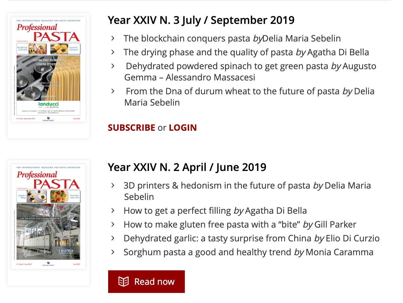 Pasta Professional blew my mind. The journal is crammed with the inside baseball of global pasta manufacturing. Industry leaders pen op-eds musing about the potential impact of Brexit on British consumption of pasta. The magazine examines a much wider collection of topics than you might imagine, ranging from the potential applications of blockchain in the industry to reports of the opening of new grain terminals in Ukraine. Pasta is not just an industry: in the pages of Pasta Professional, pasta is a lens through which to understand the world.