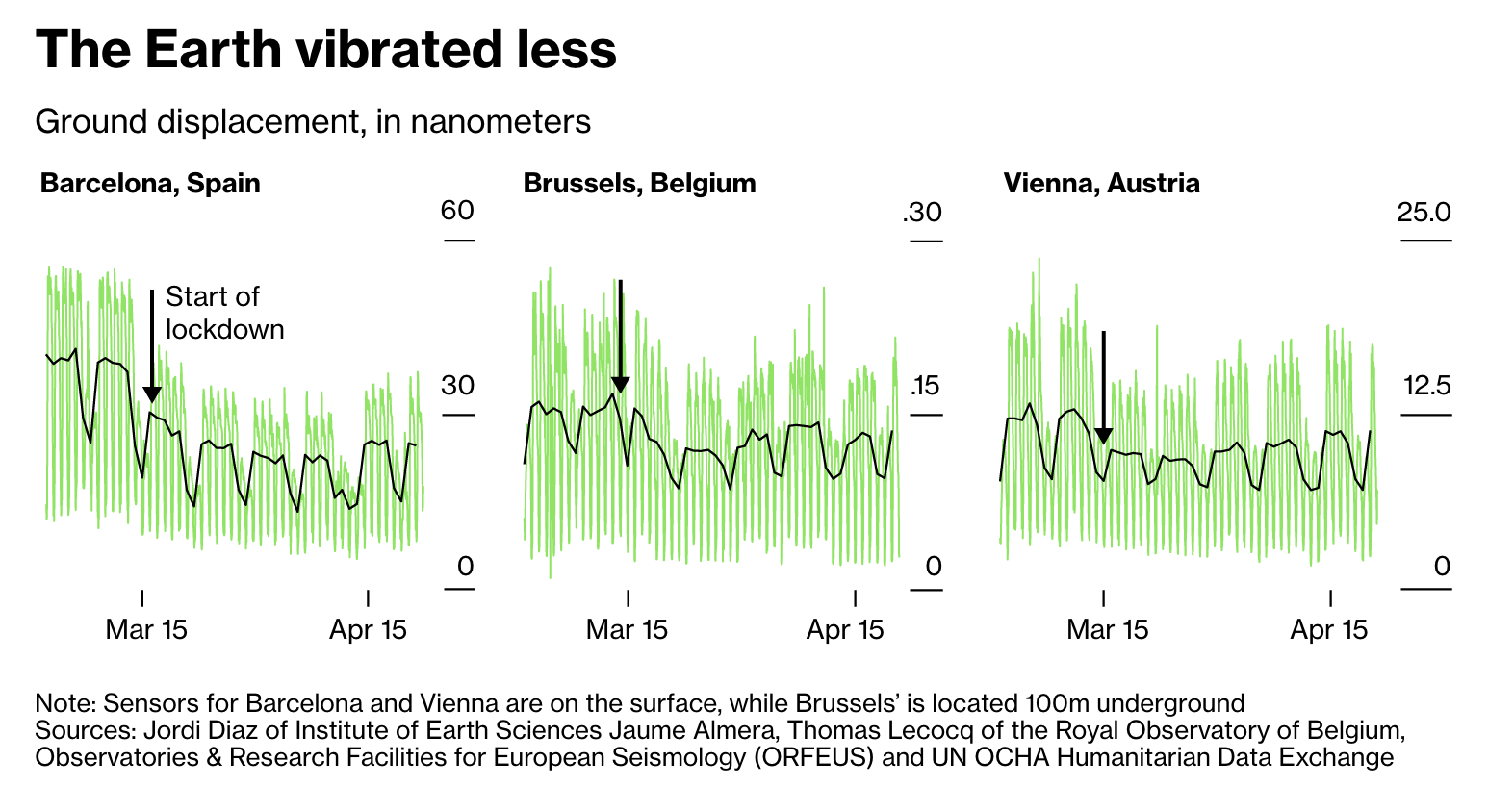From Bloomberg: “In cities, the effect of billions of humans at standstill has become evident in the Earth’s crust. Movements from everyday human activity create countless tiny vibrations in the ground. Seismometers close to or inside urban areas have registered reductions in movement.”