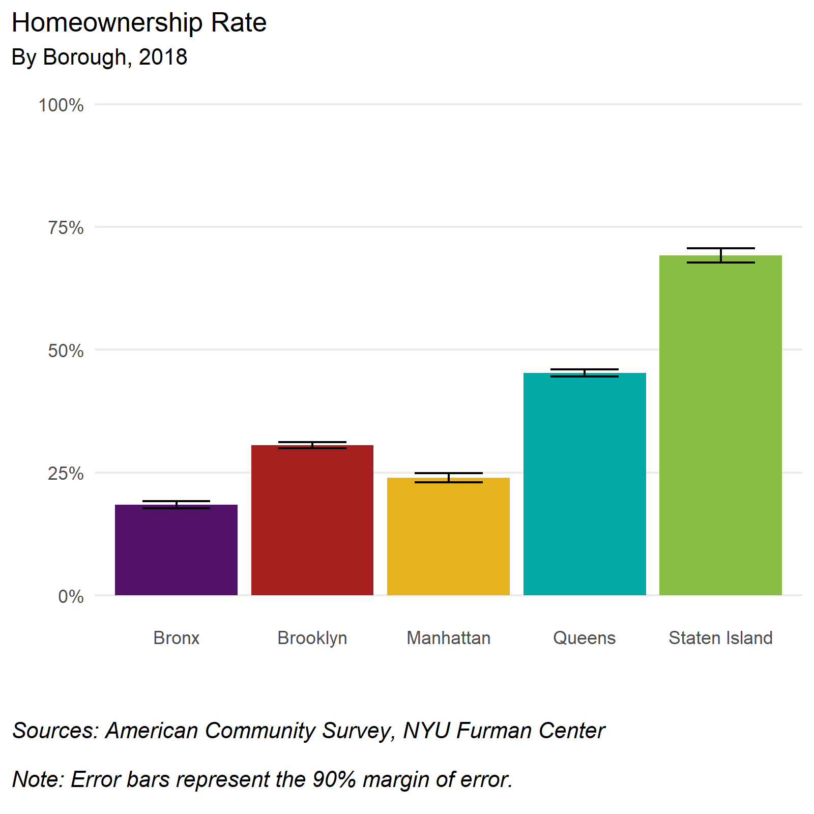 Some data from NYU’s Furman Center: “In 2018, the New York City homeownership rate was 33 percent, but it varied by borough. The homeownership rate in Staten Island was 69 percent, far closer to the national rate (64%) than any other borough. The Bronx had the lowest homeownership rate at 18 percent, approximately 45 percentage points lower than the national rate. Queens had a homeownership rate of 45 percent, Brooklyn 30 percent, and Manhattan 24 percent.” (NRB)