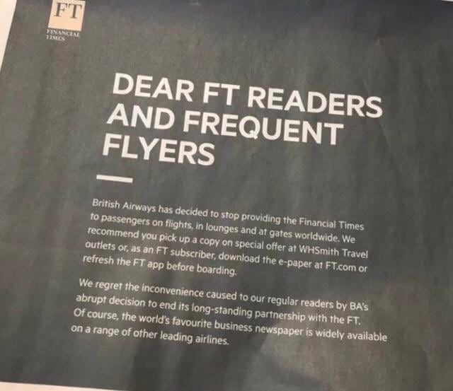 British Airways are no longer offering the FT on flights. (NRB) (Great… another reason for me not to fly BA. Also I do love some shade from my beloved pink paper - CJN)