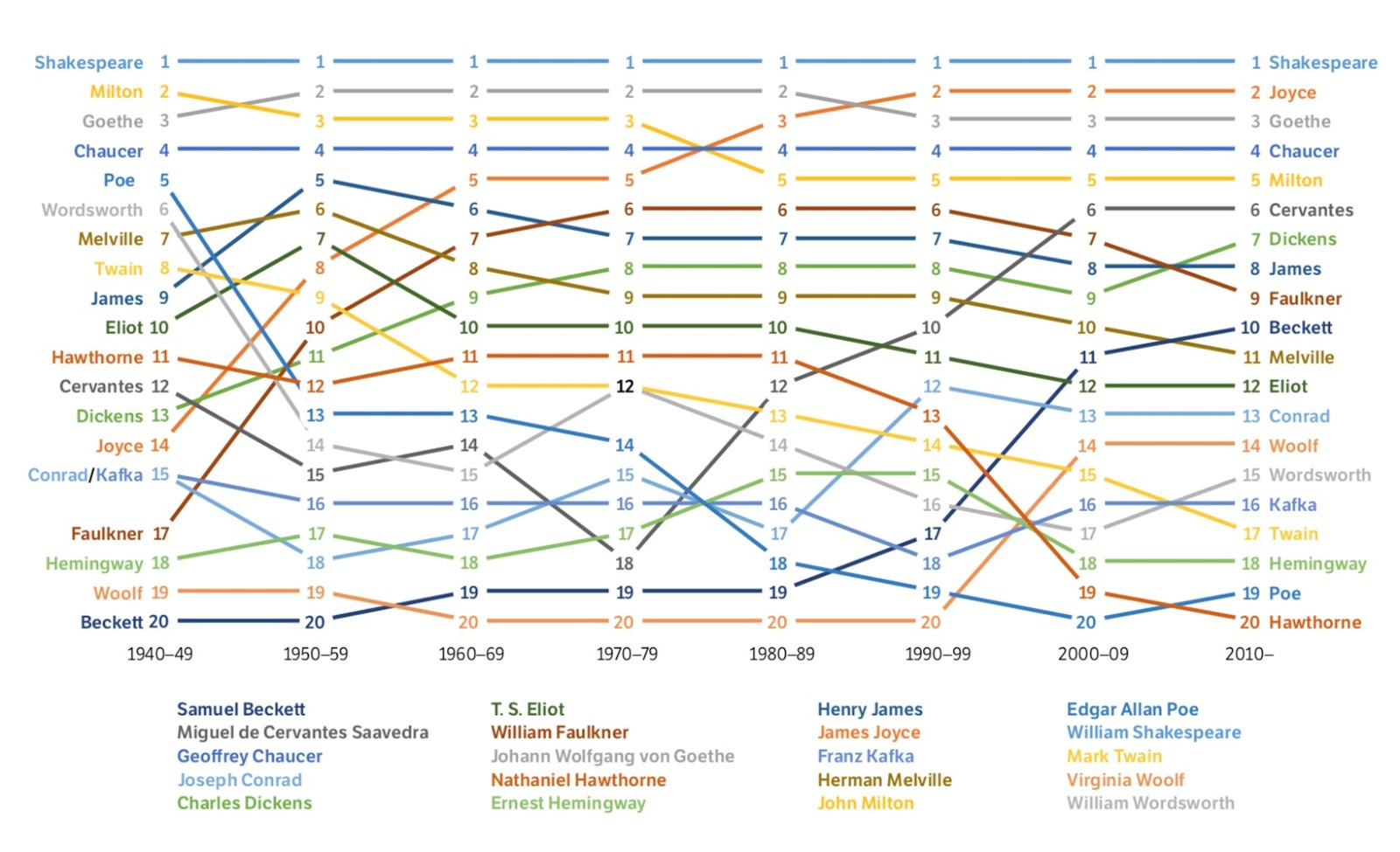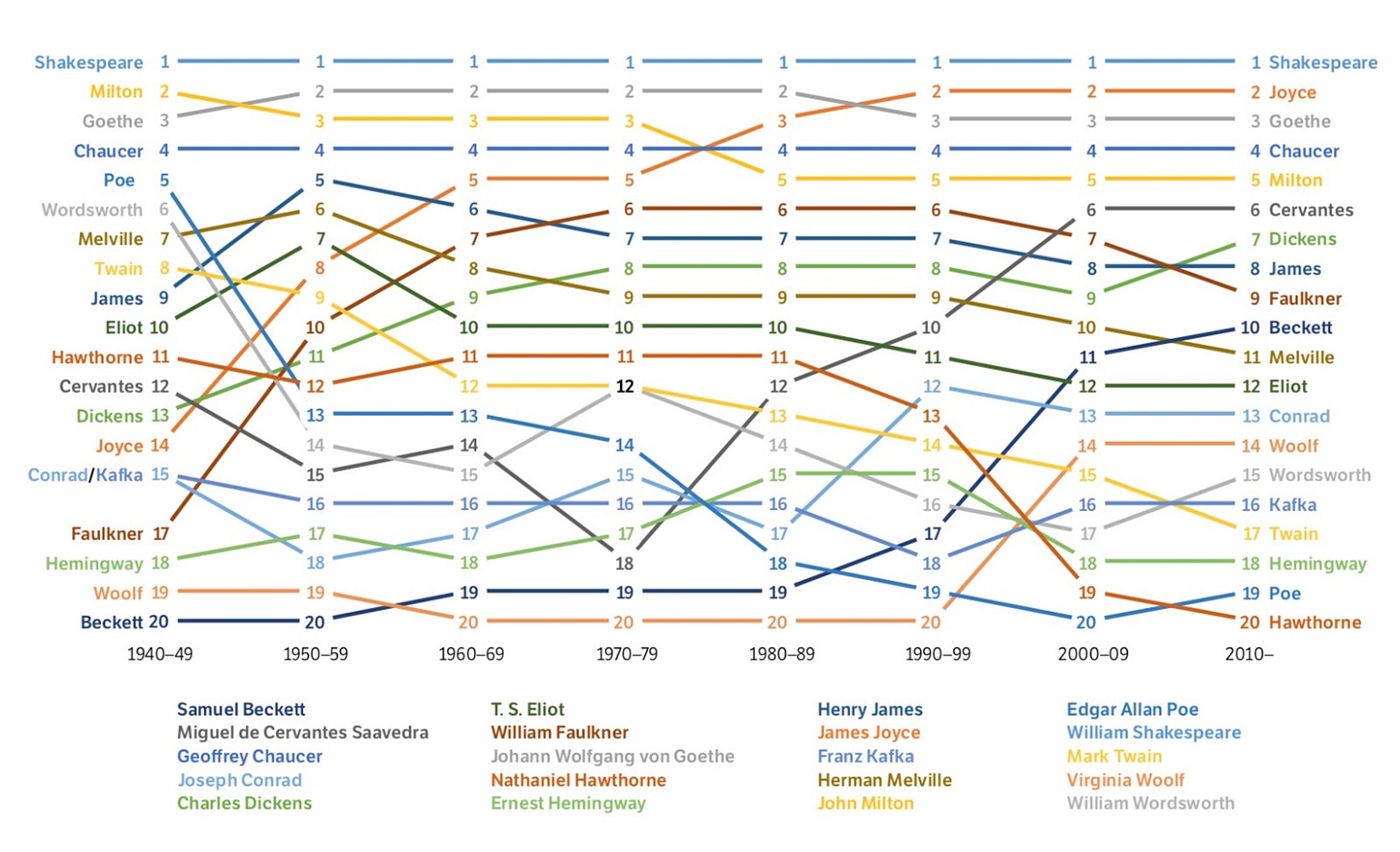 From the Stanford Literary Lab, the changing canon: “Within the MLA, for instance, critical attention has migrated over the years, not only because new authors enter the canon, but because at times former mainstays and mediocrities have switched places. Figure 9 shows a version of this in miniature, in the changing rankings by decade among the authors (from our list) with the 20 highest current MLA scores.” (NRB)